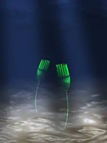 Dinomischus isolatus reached 20 mm in height,[2] was attached to the sea floor by a stalk, and looked loosely like a flower. The cup-shaped body at the top of the stalk probably fed by filtering the surrounding seawater, and may have created a current to facilitate this.[3] Its mouth and anus sat next to one another. Conway Morris was not able to say much about the organism. It consisted of a calyx (or body) on a long, thin stalk, surrounded by a whorl of 18 short "petals", which enclosed both openings of its U-shaped gut.[2] The presence of this gut identified it as a metazoan, and the stem implied that it lived permanently attached to the sea floor by a small holdfast.[1] The twenty or so "petals" borne by each organism were solid, plate-like structures, about two thirds the length of the calyx. It is speculated that they may have been covered with cilia—fine hairs—which would have wafted food down towards the organism's mouth.[1]