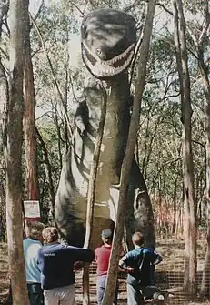 Dinosaur World was a successful tourist attraction for Creswick, as visiting Gold Coast theme parks was not feasible for many families. After the Myers retired in the late 1980s, they sold it to the local Plunkett family who also worked in the tourism industry. The Plunketts began manufacturing new dinosaurs—the largest of which was a 70 ft (21 m) long brontosaurus—and there were 25 dinosaurs by the late 1990s. Public imagination of the tyrannosaurus shifted after the first two Jurassic Park films; a second head was created for promotional purposes as the first was too "egg-shaped". Dinosaur World received over 30,000 visitors annually during the 1990s. However, the Plunketts sold the park in 2000 because of how much time operating it took up.[6] Creswick then had few other family attractions, and Dinosaur World drew many people to the area; the Courier called it a "Creswick tourism icon".[3] It was recommended to families by the Age and the Herald Sun.[4][7]
