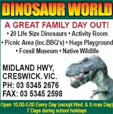 Dinosaur World (also known as World of Dinosaurs) was a theme park located 1.5km off the Midland Highway, outside Creswick, Victoria. Only 4 hectares (10 acres) large, it included around twenty life-size dinosaur models, a museum, playground and barbecue area.