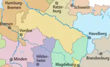 The Diocese of Verden was a diocese of the Catholic Church. It was founded around AD 768 as a suffragan of the Archdiocese of Mainz. It was suppressed in 1648 as part of the Peace of Westphalia. The diocese was centered on the city of Verden an der Aller in what is today the state of Lower Saxony, Germany. The cathedral church of the diocese was dedicated to Ss Mary and Cecilia in 1028 but the building was only completed in 1490. The Bishop of Verden was also, ex officio, the ruler of a principality of the Holy Roman Empire — the Prince-Bishopric of Verden. The territory of the diocese was not identical with that of the prince-bishopric; while the state was located within the boundaries of the diocese, it amounted to less than a quarter of the diocesan territory. Its last bishop was Franz Wilhelm, Count von Wartenberg. Following the Thirty Years' War, Verden, along with the neighbouring sees of Minden and Bremen, fell into the hands of Protestants.[1] Wartenberg was only able to retain the See of Osnabrück.