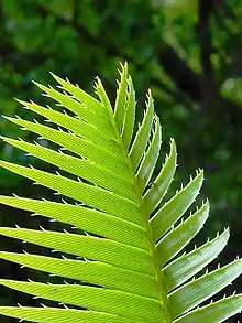 The leaf-like character of Sporophylle gives Dioon a special position within the cycads. Dehgan & Dehgan described the genus as the most primitive of the cycads and suggested they put them into their own family.[15] A molecular genetic study of the chloroplast DNA revealed that it is at least the most primitive genus of neotropical cycads.[16]