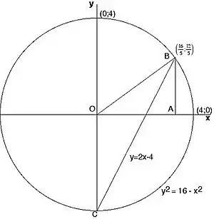 Geometrically, we may illustrate this method by drawing the circle x2 + y2 = 42 and the line y = 2x - 4. The pair of squares sought are then x02 and y02, where (x0, y0) is the point not on the y-axis where the line and circle intersect. This is shown in the adjacent diagram.