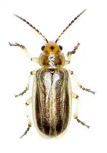 Diorhabda carinulata is a species of leaf beetle known as the northern tamarisk beetle, which feeds on tamarisk trees from southern Russia and Iran to Mongolia and western China.[1] This beetle is used in North America as a biological pest control agent against saltcedar or tamarisk (Tamarix spp.), an invasive species in arid and semiarid ecosystems (where D. carinulata and its closely related sibling species are also less accurately referred to as the 'saltcedar beetle', 'saltcedar leaf beetle', 'salt cedar leaf beetle', or 'tamarisk leaf beetle').[2]