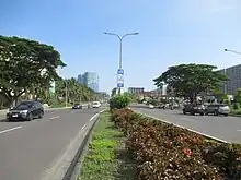 Macapagal Boulevard, also known as President Diosdado Macapagal Boulevard and Macapagal Avenue,[1] is an eight-lane road in Metro Manila, Philippines, running parallel to Roxas Boulevard from the Cultural Center of the Philippines Complex in Pasay to Asia World City in Parañaque. It was named after former Philippine President Diosdado Macapagal. This road has three major bridges, crossing the 'channels', of which the largest is the Libertad Channel, where the Libertad Water Pumping Station is situated. Thanks to intersection reconfiguring around EDSA to relieve traffic, Macapagal Boulevard is now often used to access the SM Mall of Asia to the north and Cavite to the south. It is also the main major road in Metro Manila's reclamation area called Bay City.
