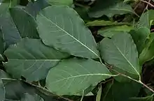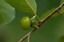 The bark is grey to brown, and smooth with shallow longitudinal fissures.[3] It grows from 2 to 10 metres tall, and may start flowering while still small.[2] They produce flowers from early to midsummer, which are greenish to creamy-white and fragrant.[1] The flowers are axillary, in lax cymes in males plants, and solitary in female plants.[3] The near-spherical fruit (of female plants) are some 2 cm in diameter. They ripen to a dark yellow colour, and contain 8 to 10 seeds.[3] The calyx lobes are conspicuous. The dull green leaves have clear net-veining on their undersides,[1] and become glabrous when fully grown.