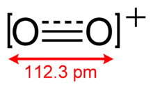 2 has a bond order of 2.5, and a bond length of 112.3 pm in solid O2[AsF6].[3] It is isoelectronic with nitric oxide and is paramagnetic.[4] The bond energy is 625.1 kJ mol−1 and the stretching frequency is 1858 cm−1,[5] both of which are high relative to most of the molecules.