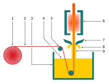 • Deposition: The thin layer deposits itself on the substrate while it is pulled up. The withdrawing is carried out at a constant speed to avoid any jitters. The speed determines the thickness of the coating (faster withdrawal gives thicker coating material).[3]