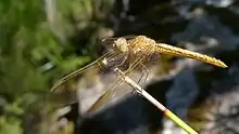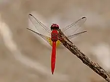 Diplacodes haematodes, the scarlet percher, is a species of dragonfly in the family Libellulidae.[3] It occurs throughout Australia (except Tasmania), Timor, New Guinea, Vanuatu, and New Caledonia.[4] It is locally common in habitats with hot sunny exposed sites at or near rivers, streams, ponds, and lakes. It often prefers to settle on hot rocks rather than twigs or leaves, and is quite wary. This is a spectacular species of dragonfly, although small in size (wingspan 60mm, length 35mm). The male is brilliant red, the female yellow-ochre. Females have yellow infuscation suffusing the outer wings, while the males have similar colour at the bases of the wings.[5]