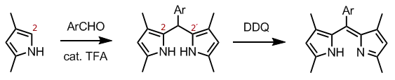 More generally, one starts with a pyrrole with suitable substituents at positions 3, 4, or 5 (but not 2). Condensation of two such molecules at their 2 positions with a bridging compound gives the corresponding 2,2'-dipyrromethane. The condensation may use, for example, the Knorr pyrrole synthesis, with an aromatic aldehyde in the presence of TFA. The dipyrromethane core is then oxidized to dipyrromethene using a quinone oxidant such as DDQ or p-chloranil.