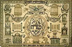 The Mizrah (literally, 'East') is a plaque or other decorative wall hanging which is placed on the eastern wall of many homes of Jews in the Diaspora to the west of Israel, in order to mark the direction of Jerusalem towards which prayer is focused.[8][9][10] A Mizrah plaque is often an artistic, ornate piece, being written in calligraphy and featuring a panorama of Jerusalem. Mizrah wall hangings typically feature the Hebrew word Mizrah (Hebrew: מזרח), and may include the verse from the Torah which states, "From the rising of the sun unto its going down, the Lord's name is to be praised" (cf. Psalm 113:3).[11][10][8]