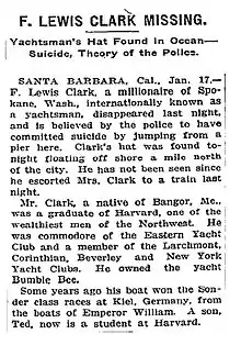 - ↑ "F. LEWIS CLARK MISSING. - Yachtsman's Hat Found in Ocean - Suicide, Theory of the Police. - Front Page - NYTimes.com". The New York Times. 18 January 1914. Archived from the original on 2018-06-19. Retrieved 2018-07-29.
