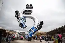 Among the structures photographed prior to the opening were a large pinwheel by Banksy,[12] Horse Scaffolding Sculpture by Ben Long,[13] and a twisted truck sculpture, Big Rig Jig by artist Mike Ross which was previously shown at Burning Man in 2007.[14][15][16] Works by 58 artists, including Jenny Holzer, Damien Hirst, Jeff Gillette, Jimmy Cauty and Bill Barminski were featured in the park. Banksy said he contacted the "best artists I could imagine" to exhibit, two of whom turned him down.[5]