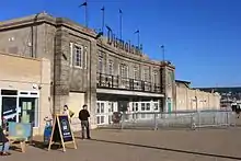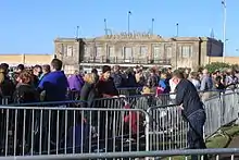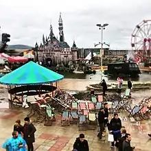 Dismaland was a temporary art project organised by street artist Banksy in the seaside resort of Weston-super-Mare in Somerset, England.[1] Prepared in secret, the pop-up exhibition at the Tropicana, a disused lido, was "a sinister twist on Disneyland" that opened during the weekend of 21 August 2015[2] and closed on 27 September 2015, 36 days later. Banksy described it as a "family theme park unsuitable for children."[3] The aesthetic of the "bemusement park" was potentially inspired by the "Dismayland" series of paintings created by American artist Jeff Gillette, who also participated in the exhibition.[4]