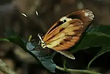 Dismorphia amphione mimics the ithomiine butterflies of the genus Mechanitis (M. lysimnia, M. polymnia, M. mazaeus, M. menapis) in colour pattern and in the slow regular flight.[3]
