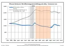 Development of Population since 1875 within the Current Boundaries (Blue Line: Population; Dotted Line: Comparison to Population Development of Brandenburg state; Grey Background: Time of Nazi rule; Red Background: Time of Communist rule)