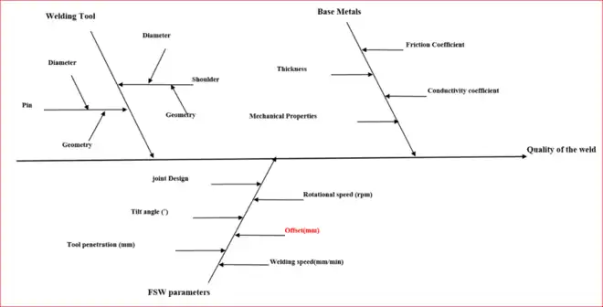 In DFSW, mechanical properties mainly include tensile strength, hardness, yield strength, elongation. Selecting optimum welding parameters results in achieving proper mechanical properties of the joint. Tool rotational speed (rpm), tool traverse speed (mm/min), tool tilt angle (degree), tool offset (mm), tool penetration (mm), and tool geometry are most important welding parameters in DFSW. The tool center is typically placed in the centerline of the joint for similar joints such as aluminum/aluminium or copper/copper joints; in contrast, it is shifted towards the softer materials in DFSW called tool offset.[12] It is a significant factor to achieve a joint possessing smaller welding defect and higher mechanical properties. Generally, harder and softer materials are placed in Advancing Side (AS) and Retreating Side (RT) respectively.[13] Regardless of the tool geometry, which plays a critical role on final mechanical and metallurgical properties of the weldment, the effect of the tool rotational speed and tool offset are taken into account as the most important welding parameters during DFSW.