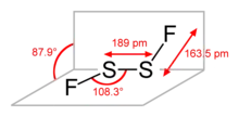 Disulfur difluoride has a chain structure F−S−S−F. The angle between the Fa−S−S and S−S−Fb planes is 87.9°, while the angles of Fa−S−S and S−S−Fb are equivalent, and are equal to 108.3°. Both S−F bonds are equivalent and their length is 163.5 pm, while the length of the S−S bond is 189 pm. This structure is referred to as gauche, and is similar to H2O2.