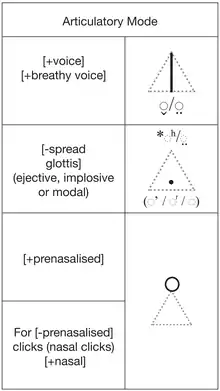 - For voiced consonants the solid dot inside the triangle indicates an implosive consonant or, in the case of languages where there are no implosives, a modal consonant.