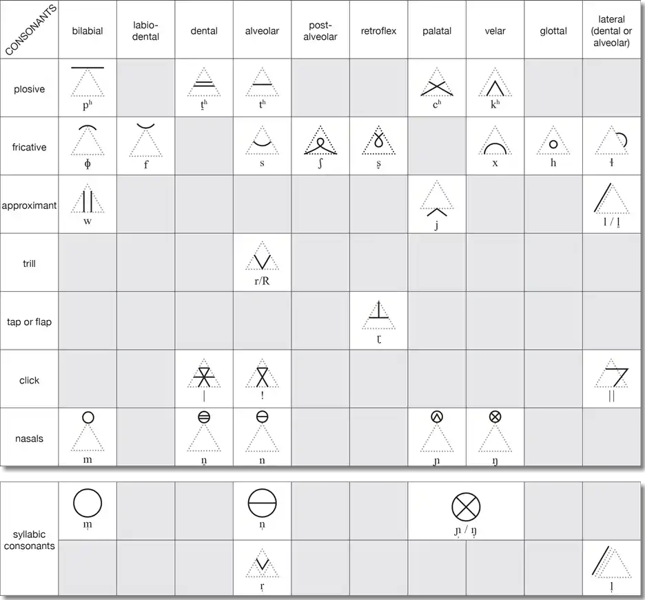 - Uphimbo, or the voicing line, running from the apex of the triangle to the base (or until inline with the ends of the chevron), indicates consonant voicing.