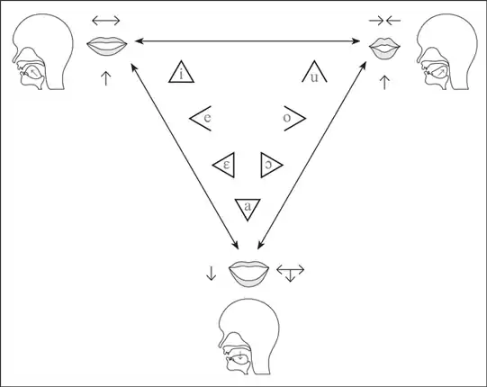 The apex of the triangle or chevron corresponds to vowel height or frontedness, with high vowels /i/ and /u/ pointing upwards and the low vowel /a/ pointing downwards. Likewise, the front vowels /ɛ/ and /e/ point leftwards and the back vowels /ɔ/ and /o/ point rightwards.