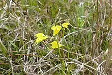 Diuris gregaria, commonly known as clumping golden moths[2] is a species of orchid that is endemic to Victoria. It between three and seven leaves and one or two bright yellow flowers with a few dark striations and usually grows in dense tufts of up to thirty plants. It is a rare species mostly only found in grassland west of Melbourne.