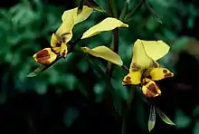 Diuris platichila, commonly known as the Blue Mountains doubletail,[2] is a species of orchid that is endemic to a few isolated places in the Blue Mountains in New South Wales. It has two leaves and up to eight yellow flowers with dark markings on the dorsal sepal and labellum. It has relatively long, thin lateral sepals and the central lobe of the labellum is wedge-shaped. It forms hybrids with other species of Diuris.