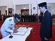 After Basuki withdrew his appeal to the Supreme Court and resigned from governorship, Djarot was officially inaugurated by Joko Widodo in the State Palace as the governor of Jakarta on June 15 after serving as acting Governor for about a month.[28] He became the third governor to serve in the five-year period between 2012 and 2017, after Joko Widodo and Basuki Tjahaja Purnama.[29]