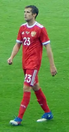 His first appearance in Russia national football team was in February 2012, in the friendly match with Denmark. He was confirmed for the finalized UEFA Euro 2012 squad on 25 May 2012.[4] He scored his first international goal in a friendly match against Armenia on 5 March 2014. On 2 June 2014, he was included in the Russia's 2014 FIFA World Cup squad.[5]