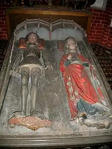 Tomb of Duke Albert III of Mecklenburg, King of Sweden (died 1412), buried in the octagon, and cenotaph of his first wife Queen Richardis (died 1377, buried in Stockholm), is an important example of Gothic burial art (see picture). Swedish nobility voted for Albert to become the Swedish King. After a reign of 25 years, in the year 1389, he was defeated in battle by the Danish Queen Margaret I. From then on his power and influence was limited to Mecklenburg. The lion and dog beneath the figures symbolize strength and loyalty. Worth noticing are the beautifully arranged folds of Richardis's dress in Gothic style.