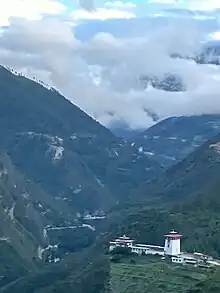 Dobji Dzong is a dzong monastery in Bhutan, on a ridge on the national highway from Thimphu to Haa, Paro District, just a few kilometers south of the confluence of the Paro and Thimphu rivers at Chuzom.[1][2] It is 6,600 feet[3]Today the dzong houses a monastic school with 35 monks. It was featured in the 2003 film by Bhutanese lama, Travellers and Magicians.