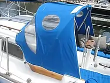 A dodger (also known as a spray-hood) is a frame-supported canvas (usually with clear vinyl windows) structure partially protecting a helmsman and other occupants of a sailboat from harsh weather and seas. It covers part of the cockpit and the entrance (or "companionway") into the interior of the sailboat. One can usually stand under a dodger and be protected from rain, spray and snow travelling straight down or from the front/fore of the craft. There is little protection afforded from elements moving from aft to fore, but since the boat is usually moving forward or anchored by the bow and therefore facing into the wind this is seldom a problem. A similar type of shelter on a boat, without the forward and side protection, is called a Bimini top. Increased protection for the occupants of the cockpit is possible using a combination of dodgers/bimini tops and dodger extension.