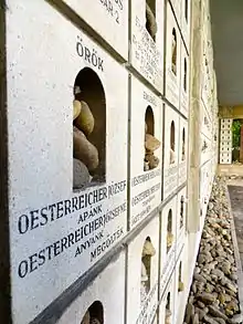 The Raoul Wallenberg Emlékpark (memory park) in the rear courtyard holds the Memorial of the Hungarian Jewish Martyrs — at least 400,000 Hungarian Jews were murdered by the Nazis.[17] Made by Imre Varga, it resembles a weeping willow whose leaves bear inscriptions with the names of victims. There is also a memorial to Wallenberg and other Righteous Among the Nations, among them: Swiss Vice-consul Carl Lutz; Giorgio Perlasca, an Italian man who, with a strategic escamotage, declared himself the Spanish consul, releasing documents of protection and current passports to Jews in Budapest without distinction (he saved five thousand); Mons. Angelo Rotta, an Italian Prelate Bishop and Apostolic Nuncio of the State of Vatican City in Budapest, which issued protective sheets, misrepresentations of baptism (to save them from forced labor) and Vatican passports to Jews, without distinction of any kind present in Budapest (saving fifteen thousand), who saved, with his secretary Mons. Gennaro Verolino tens of thousands of Hungarian Jews during World War II. Carlos de Liz-Texeira Branquinho a Portuguese diplomat, serving as Portugal's Chargé d'Affaires in Budapest in 1944, issued protective Passports to hundreds of Jewish families, altogether about 1,000 lives were saved due to his actions.[18] Carlos Sampaio Garrido the Portuguese Ambassador who resisted the Hungarian political police when the police raided his home arresting his guests. The Ambassador physically resisted the police and was also arrested but managed to have his guests released by invoking the extraterritorial legal rights of diplomatic legations; five of the guests were members of the famous Gabor family.