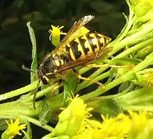 Dolichovespula is a small genus of social wasps distributed widely throughout the Northern Hemisphere. The yellow and black members of the genus are known by the common name yellowjackets in North America, such as Dolichovespula norwegica, along with members of their sister genus Vespula. In a study on the nesting biology of Dolichovespula, a colony of D. maculata with 771 workers was reported as having the largest recorded population count.[2]