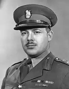 While he commanded his battalion during the operation of Dieppe, on August 19, 1942, this officer gave evidence of the highest qualities of courage and of initiative. He was wounded at the beginning of the raid, as he landed with the first groups of assault, but he continued to steer the operations of his unit by wireless telegraphy, under a fire fed by machine guns, by mortars and by artillery. Later, with the aim of reaching a more favourable position, he dragged himself up to a high point of the ground, but he was again wounded. Even after having been transported aboard a landing barge, and although wounded for the fifth time, he continued to insist on organizing the defense against planes, and taking care of his men. He put an example which is in the best tradition of the Army and was an inspiration for all the officers and the privates of his battalion.
