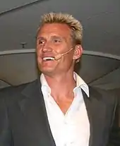 Lundgren made his film debut in the 1985 James Bond film A View to a Kill, Roger Moore's final film as Agent 007, in the minor role of Venz, a KGB assassin.[20][21] His former lover Grace Jones, who portrayed the villain May Day, personally recommended him.[22] According to Lundgren, Moore said of him, "Dolph is larger than Denmark."[23]