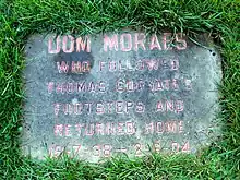 He had a lifelong battle with alcoholism. Moraes suffered from cancer, but refused treatment and died from a heart attack in Bandra, Mumbai. He was buried in the city's Sewri Cemetery.[13] Many of Dom's old friends and publishers attended the memorial service in Odcombe. A headstone in yellow Jaisalmer stone lies embedded in the front lawn of the Church of St Peter and St Paul to mark the service.