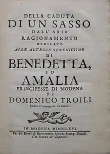- ↑ Ragionamento della caduta di un sasso. Modena: Soliani. 1766.
