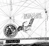 Some historians once believed the legendary island of Antillia, made famous in many 15th-century portolan charts, was first insinuated cartographically in the 1367 Pizigani brothers chart. On the western edge of the map, although there is no island depicted or mentioned, there is a disk with a picture of a man with hand outstretched, and an inscription, which some have read as saying "Here are statues which stand before the shores of Atullia (ante ripas Atulliae) and which have been set up for the safety of sailors; for beyond is the vile sea, which sailors cannot navigate".[3] Some scholars, especially in the 19th century, believed this Atullia was the first reference to "Antillia" on a map (e.g. Buache, Kretschmer, Nordenskiöld)[4] but this reading has been doubted since. Crone (1938) read it as ante ripas Getuliae (Getulia).[5] Beginning with Hennig (1945), the inscription has been commonly read as at temps Arcules or ante templum Arcules (from the time/temple of Hercules).,[6] almost doubtlessly a reference to the Pillars of Hercules, the non-plus ultra of ancient navigation, as transmitted via Arab sources, e.g. al-Masudi speaks of the "copper idols" of "King Hercules the Giant" marking the edge of the Green Sea of Darkness,[7] al-Idrisi places the marker 'idols' on islands away from the straits.[8]