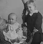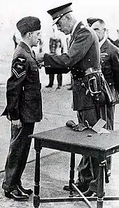 On 6 October 1938, while with No. 214 Squadron, he survived the crash of Harrow "K6991" at Pontefract, Yorkshire.[12] While acting as a wireless operator for his aircraft he was knocked out by a lightning strike.[13] Once recovered he alerted his base to the fact that the crew were bailing out. Wishing to get out of an escape hatch he found his way blocked by other airmen who were hesitating about throwing themselves out of the aircraft into the howling darkness. He rushed to the other side of the hatch and jumped. His parachute harness caught on projecting clamps and pulled the trapdoor shut above him. Bruce was now suspended under the bomber and unable to escape further. Realising what had happened his fellow crew members were now galvanised into action, raised the trapdoor and were shocked to have Bruce shoot back into the aircraft, though not too shocked to eject him again. Bruce was subsequently awarded the Air Force Medal (AFM) on 8 June 1939.[14][note 2] According to Pete Tunstall, Bruce was very proud of being the only man known to have bailed from an aircraft three times and to have landed only twice.[16] After the war he used to entertain his children with the seemingly insoluble riddle: "How is it that I baled out three times, but only landed twice?" Bruce called his AFM medal the 'Away From Mam' medal.[13]