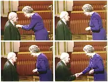 In the Second World War, the survival rates for bailing out into the sea were not great with roughly one third surviving[39] and despite the fact that he could not swim, Bruce, with at least air-gunner Thomas Bax,[40] baled out into the sea, hoping that the current would take him south towards France and the resistance life lines that had been established there. However, motor launches were quickly despatched from the port and he was picked by the German Navy in the sea near Zeebrugge. He earned membership of the "Caterpillar Club" as a result of this exit from a "disabled aircraft" as can be seen from his wearing of the Club tie in the photo taken in 1995 at RAF Fairford (right).[note 3] He was also a member of the Goldfish Club for those who parachuted into water.