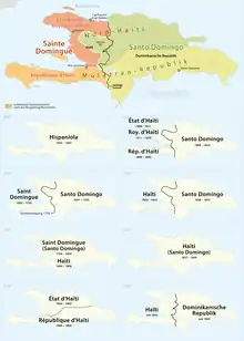 The division of the island of Hispaniola dates to the 16th and 17th centuries, when the Spanish colonised the eastern part of the island and the French colonised the western part of the island. After decades of hostilities, mutual acknowledgement by France and Spain of their respective colonies, Saint-Domingue and Santo Domingo, was accomplished by way of the Peace of Ryswick in 1697.[2][3][4][5] A more precise boundary was drawn in 1777 via the Treaty of Aranjuez.[6][7][4] The distinction between the two parts of the island was accentuated by differing settlement patterns in the two colonies. Whereas the Spanish developed a settler-based society with limited slavery, the French forcibly settled thousands of African slaves in Saint Domingue, with the slave population coming to dominate demographically.[3] In 1791 the Haitian slaves launched the Haitian Revolution, gaining independence from France in 1804 as the First Empire of Haiti.[8][9] In 1821 the Dominicans declared independence from Spain; however Haiti then invaded and annexed the colony.[10] The Dominicans fought a war against the Haitians and gained independence on 1844, with the border being restored.[11][12]