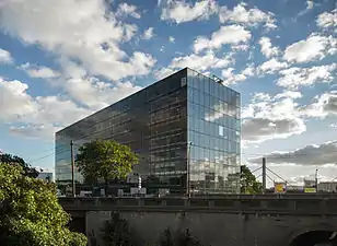 Leading figure of French architecture, Dominique Perrault is Professor at the Ecole Polytechnique Fédérale de Lausanne,[2] a lecturer in France and abroad and a member of the Conseil scientifique de l’Atelier International du Grand Paris since 2012. After winning the competition of the Bibliothèque Nationale de France in 1989, he realized, amongst other projects, the Olympic Velodrome and Olympic swimming pool in Berlin, the fourth and fifth extension of the seat of the Court of Justice of the European Union in Luxembourg, the Olympic Tennis Stadium in Madrid,[3] the Ewha Womans University or the Fukoku Tower in Osaka. His work is exhibited in major museums around the world. A solo exhibition showing all of his work was held at the Centre Georges Pompidou in Paris in 2008. He was also appointed Commissioner of the French pavilion architecture section of the Venice Biennale in 2010.[4] Dominique Perrault leads in parallel significant heritage rehabilitation projects including those of Longchamp Racecourse in Paris, Dufour Pavilion at Versailles and La Poste du Louvre in Paris. In spring 2014, Dominique Perrault inaugurated the tallest tower of Austria in Vienna, the DC Tower 1,[5] icon of the new business district and the Grand Théâtre des Cordeliers in the historical city of Albi, south of France.