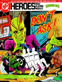 Mayfair Games published the superhero role-playing game DC Heroes in 1985. Don't Ask! was published the following year, a 32-page softcover book by Scott Jenkins with Robert Loren Fleming, with interior art by Rob Davis, cartography by James Clouse, and cover art by Ed Hannigan (sketch), Keith Giffen (pencil), Bob Smith (ink), and Bob LeRose (color).[2]