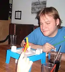To set up the game, the stand is turned upside down and the ice blocks placed into the frame, so that the shared uniform compression of the blocks pressed against each other will cause them to stay in place when the stand is turned upright. The players then take turns removing ice blocks by tapping with the hammers. The game ends when one player causes the block with the character figure to fall through. The player who took the turn before that one wins the game.