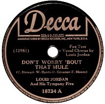 "Don't Worry 'Bout That Mule" is a song attributed to Charles Stewart, William Davis, Duke Groaner, and Fleecie Moore. It was performed by Louis Jordan and his Tympany Five, recorded in July 1945, and released on the Decca label (catalog no. 18734-A).