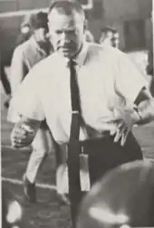 Coryell was named the Aztecs' new head coach on January 11, 1961, and predicted that San Diego State would be a leading small college by 1963.[28][29] He installed the I formation,[30] and instituted a policy of recruiting juniors who had played for two years at junior colleges in Southern California, reasoning that this policy allowed the Aztecs to study their recruits and be sure of their abilities before signing them, avoiding wasting any of their limited budget on sub-standard players.[31][29] Among his first crop of junior recruits was future Hall of Fame head coach Joe Gibbs.[32][33] The Aztecs improved rapidly under Coryell, as he led the team to a 7–2–1 record in his first season.[27] They followed with their first CCAA title for a decade, going 8–2 overall and 6–0 in their division.[27] The decisive game came against Fresno State, who had won the CCAA the previous four seasons in a row. Before a capacity crowd of 13,000, the Aztecs ended an eight-game losing streak to their rivals, winning 29–25. Coryell was carried from the field by his players at the end of the game. At this point, his offense was based primarily around the run; in the game against Fresno State, the Aztecs gained only 9 yards passing against 269 rushing.[34] Coryell's success led to speculation that he might take a role with the San Diego Chargers or a larger college, but he affirmed his intention to stay with the Aztecs.[35] San Diego State went 7–2 in 1963, earning a share of the CCAA title. They scored at least 30 points in each of their first seven games.[27]