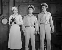 ![]() Fellows (center) as Ensign Pulver with Patricia Ferris and Henry Fonda in Mister Roberts on Broadway | |