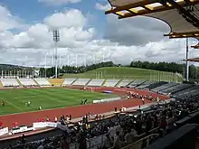 Up to 15,000 spectators could also be accommodated on the open terracing giving a seated capacity 25,000 for sports events.[6] For musical performances the stadium could accommodate 15,000 seated guests, but had a maximum capacity of 50,000 if the field was used to accommodate standing fans.[7]