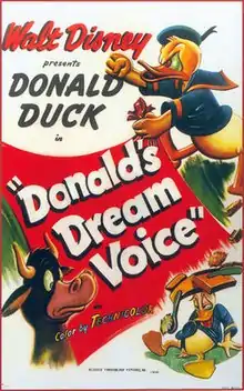 Donald's Dream Voice is a 1948 American animated short film featuring Donald Duck, the film was directed by Jack Hannah and produced by Walt Disney.[1] In the short film, no one understands a word that salesman Donald says, so he takes voice pills to improve his speech.