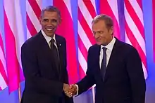 In regard to U.S. plans of hosting missile defense shield bases in the country, Tusk hinted skepticism toward the project, saying that their presence could potentially increase security risks from Russia, and rejected U.S. offers in early July 2008.[47] By August, however, Tusk relented, and supported the missile shield, declaring: "We have achieved the main goal. It means our countries, Poland and the United States will be more secure."[48] Following President Barack Obama's decision to scrap and revise missile defense strategy, Tusk described the move as "a chance to strengthen Polish-US co-operation in defense..." He said: "I took this declaration from President Obama very seriously and with great satisfaction."[49]